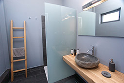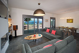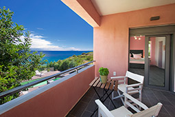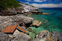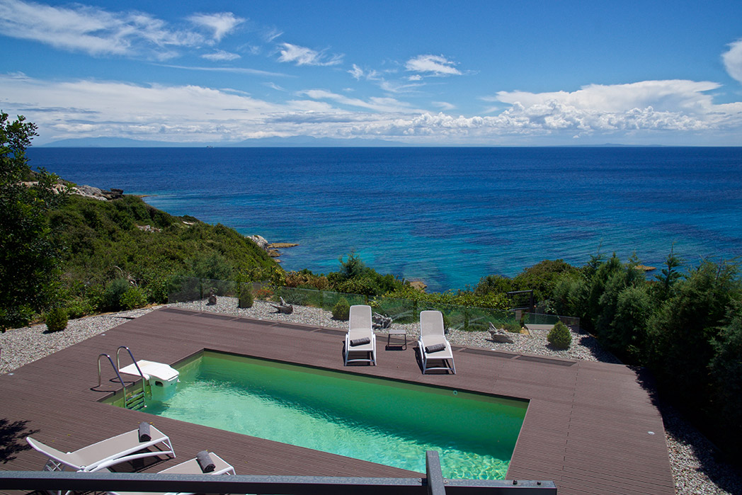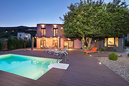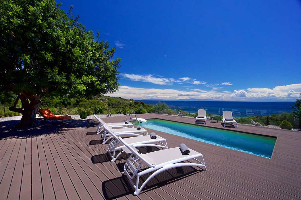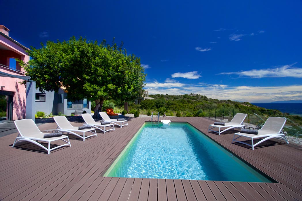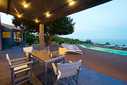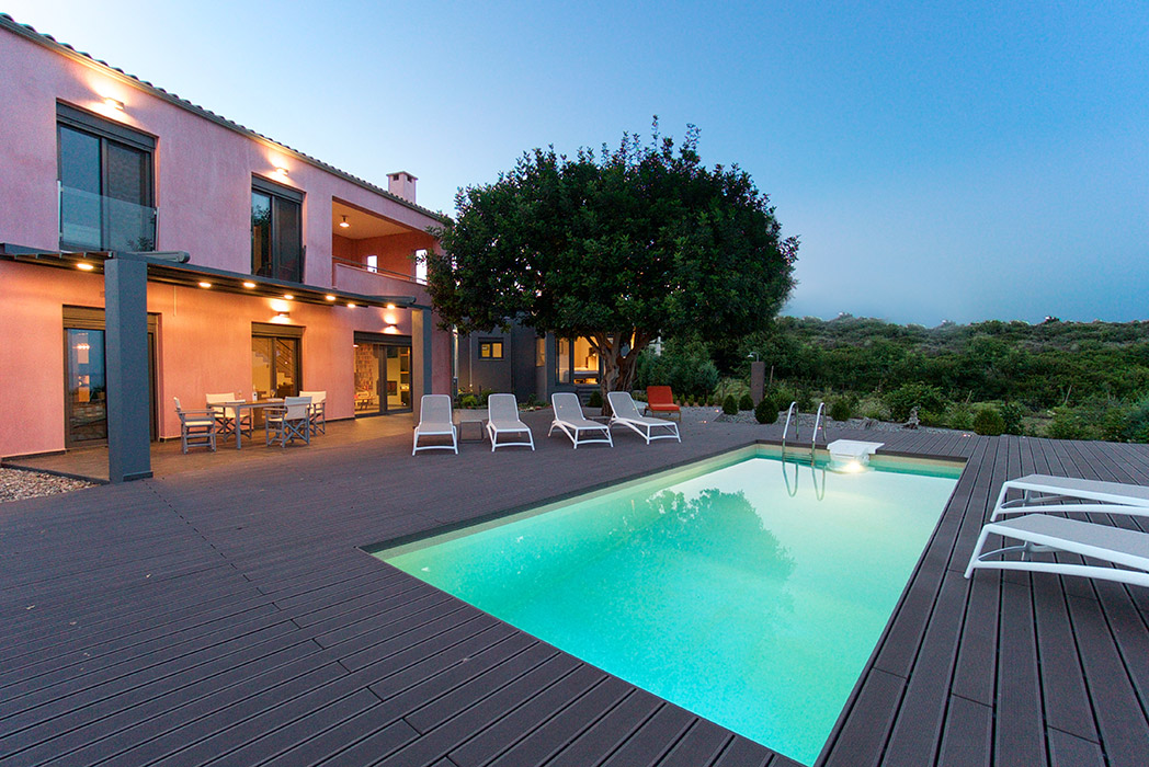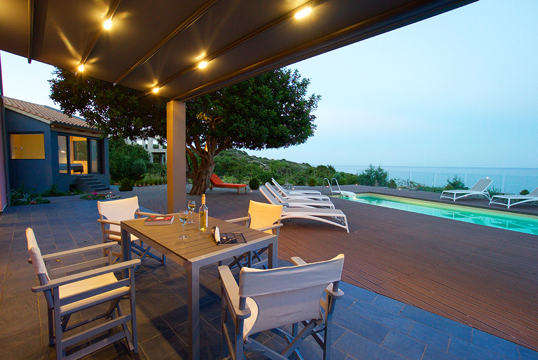 Villa Marina is a luxurious holiday residence, located 2km from the center of Skala, one of the most beautiful beach resorts on the South East of Kefalonia. Close to the center of the town enjoying its nightlife, services, beaches and restaurants, still far enough to enjoy complete privacy, peace and serenity, ideal for relaxing holidays. Villa Marina offers a decked terrace with dining area, sunbeds, shaded by an opening pergola and a private pool with amazing sea view. It also has the special advantage of a private access to the sea, just a few steps down from the pool, where we have created a wooden deck and stairs to facilitate your access.