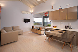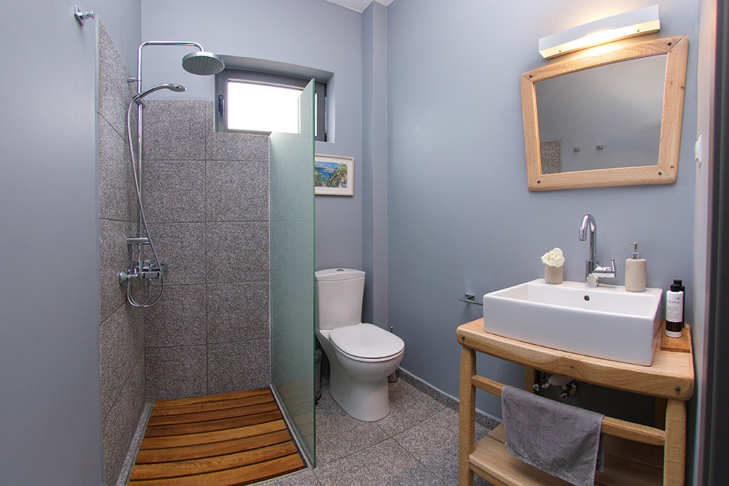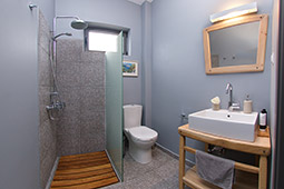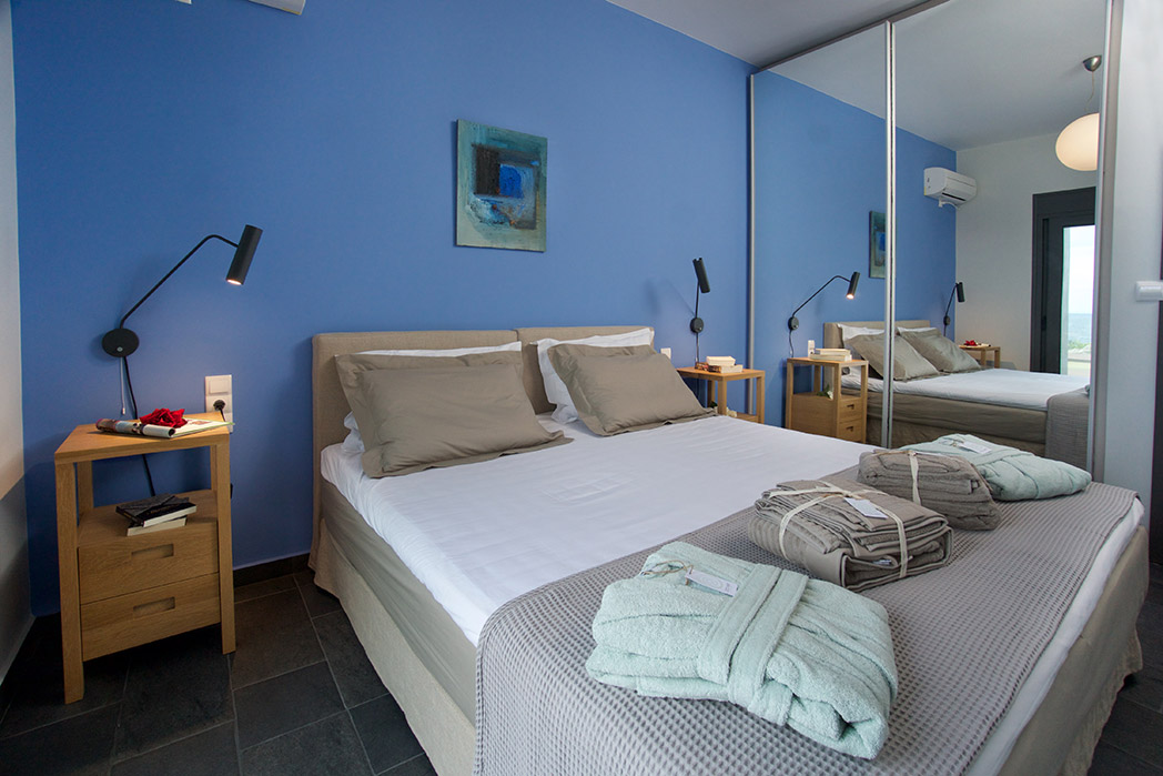 In the main house on the upper level there is a Master bedroom with en suite bathroom and a private veranda with amazing view to both sea and the pool area. The ground floor consists of a spacious living room, dining area for 8 guests and a fully equipped open kitchen. On this same floor there is a second double bedroom with openings to the pool area, as well as a second bathroom.