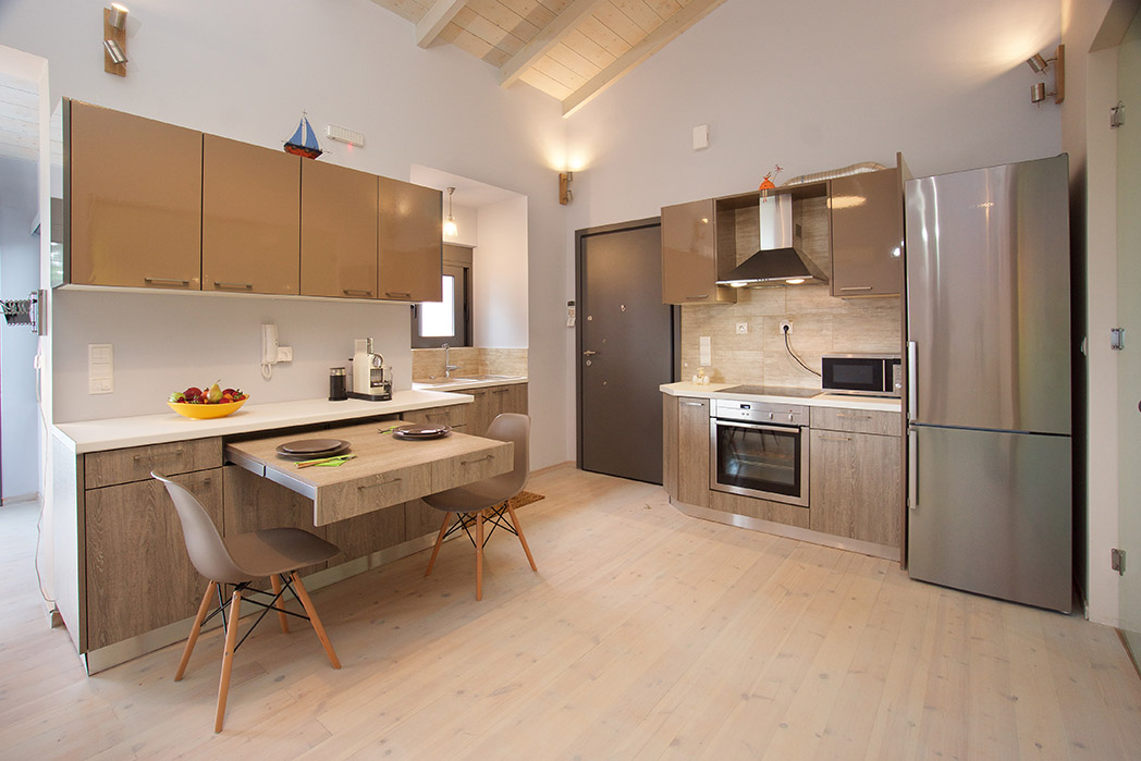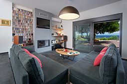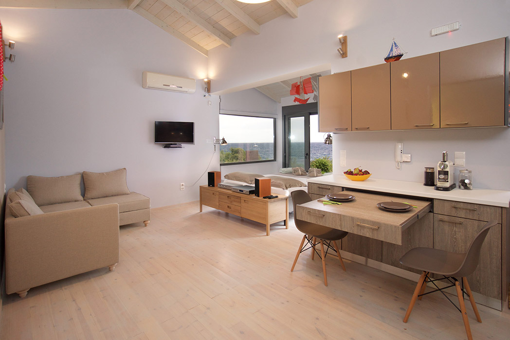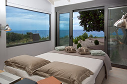The separate Guest house is located a few meters from the main property and consists of a studio with double bed, with elevating mechanism to facilitate admiring the breathtaking view to the pool area and the sea while reading, relaxing or working on your laptop. There is as well an open kitchen and table/desk and a shower-wc.